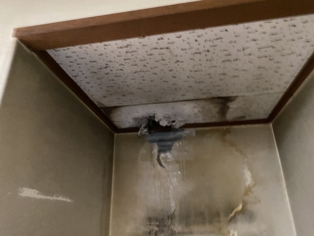 この下の2階天井押入れ付近が、雨でにじんでいます。